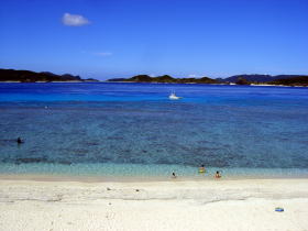 | ダイビング船がいる所がお勧めポイントになります。手前はサンゴ礁になります。干潮時には泳いでもお腹を擦りそうな場所もあります。 | 安室島と渡嘉敷島が見えます。右の奥の方も割と楽しめます。 | ビーチ左側。 |