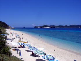 | お勧めスポット | ともかく海の見た目も綺麗ですし、泳いでみてもサンゴ&魚が豊富で文句なし。海流は横に流れてるので沖に流される心配はまずないし、ハブクラゲがいないことはかなりの強み。慶良間諸島は海が綺麗なためハブクラゲは発生しないそうです。ただし、まず刺されませんが、普通のクラゲは所々います。 お勧めスポットはビーチにある展望所の丁度真っ正面辺りの海です。大抵ダイビング船がいるのですぐ分かると思います。大きいサンゴとそれを取り巻く魚達に感動もひとしおです。でも、餌付けされているのか魚がこちらへ寄って来ることが多いのはいただけない。若干魚種に偏りが見られる気もします。それ以上奥に行ってもサンゴはなく真っ白い海底砂漠が広がるのみです。もっとも、ドロップオフまで行くと海底にはサンゴがあるみたいですが。 観光客の方が泳いでいる場所が大体お勧めスポットですが、そこ以外でも泳いでみたい方は、ビーチの南側(右側)200m程ぐらい?に行けば枝サンゴが多い場所もあります。昔は、こちら側で泳いでいたみたい。ビーチの北側(左側)は、100m先までは楽しめますが、それ以上行くと若干濁り気味となり、場所によってはクラゲが結構いたりします。サンゴや魚が多い場所も少なさそうです。もっとも、更に数百メートル先まで行くとどうなのかは分かりません。上から見下ろした感じでは良さそうな場所もありますけどね。 |