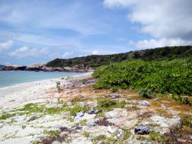| 西側に面したビーチ。名前は特にないようです。キャンプ禁止ということは逆に泳ぐのはいいのかな? | ウン島方面。 | 遠くには外地島・慶留間島・阿嘉島が見えます。 |
