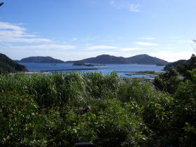 | 塔の文「静ふる ツヅジ花咲く 岡の上 玉と砕けし人々の 御霊を永久に 島守りの神と 祀らん村人は 1957年3月26日」 | 「ふるさとの 山河に散りし、御霊らの 溢れる無念(おもい) 永久に忘れし」 | 碑の前から見える光景。 |