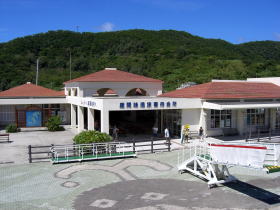 | 座間味島の玄関口座間味港。阿嘉港と同じくとても港とは思えないほど綺麗です。港内には観光案内所があるので、降りたらまずここで情報を集めるのがよいでしょう。座間味村関係のお土産も充実しているので、ぶらぶらするだけでも楽しいです。お勧めは、なまり節や、無難なところですが座間味島でしか売っていないTシャツなど。 外にベンチもあるので、暇なときはオリオンビールでも飲みながらのんびりするのも最高です。ベンチのある広場ではたまにアーティストがライブとかやってますよね。 |