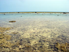 | ここも綺麗にイノーが広がっています。 | アダンの木 | 砂浜とサンゴの欠片 |