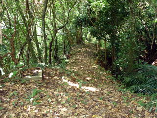 | かなり拝所は多いです。「国頭村史」を見ると、比地集落は幾つかの血縁団体が集まって出来た集落なようで、各門中の拝所があるとのことだから、このように数が多いのでしょうか。上述今帰仁村歴史文化センターのサイトでは住居跡と説明されています。ここに住居があったと想像すると、古琉球の村落を垣間見ることができます。 | 頂上付近の平場に到着。 |