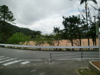 | 入口前の道。小学校のグラウンドが見えます。 | グスクの南側の道から。反対側には数軒民家があるだけで入口はありません。 |