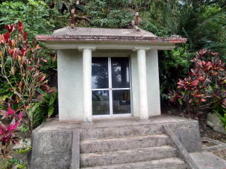 | 入口から少し登った所。石垣はあるが、最近のものに見える。 | 中腹の平坦部には殿らしきものが。「ぐすく」によると、土帝君だとのこと。「国頭村史」に奥間の土帝君(トーチーク)の話も載っています。何でも沖縄には17体しかないそうです。由来は不明だが、旧暦2月2日は土地爺の誕生日であり例祭が行われるとのこと。 |