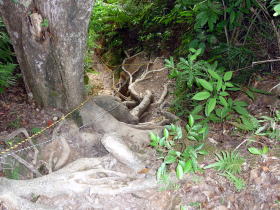 | ここもアメリカ人がたくさん来るらしく、安波小による英語の警告文がありました。 | ここから降りるわけです。いきなり断崖に見える。 | 滑り落ちそうな道です。木の根や幹、ロープを伝いながら上手く降りましょう。 |
