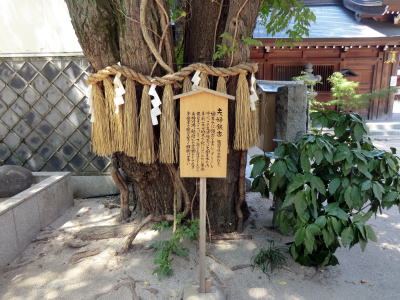 | 恵比須宮 | 夫婦銀杏。「博多では銀杏と書いて「ぎなん」と呼ぶ。この夫婦銀杏は大樹三本の内手前一本が雌木で秋にはたわわに黄金色の実をつける。子孫を宿すところから夫婦円満、縁結びの霊樹として氏子崇敬者の敬愛篤く願掛けが多い。」とのこと。 |