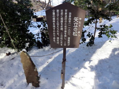 | 矢立の松。源義経がこの松に矢を射立てたという。冬だと根株すら見えません。 | 社殿が見えてきました。 |