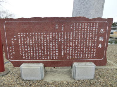 | 息栖神社と河岸 | 忍潮井について「忍潮井は男瓶・女瓶と呼ばれる二つの井戸であり神功皇后の三年(194年)に造られたものと云われあたり一面海面におヽわれていた頃真水淡水の水脈を発見しこれを噴出させ住民の生活としたもので海水をおしのけて清水が湧出していることから、忍潮井の名がつかられたと伝えられている。水と人類とのかヽかわりの中で最も古いかたちの井戸であり日本三霊泉の一つと云われております。」。 伝説について「その昔(平城天皇の御宇大同二年四月(八〇九年)数キロ下流の日川地区より息栖神社が此の地に移された際とり残されてしまった男・女二つの瓶は神のあとを慕って三日三晩哭き続けたが、とうとう自力で川を溯ぼり一の鳥居の下にヒタリ据え付いたと云う此の地に定着して後もときどき日川を恋しがり二つの瓶は泣いたと云われている。日川地区には瓶の泣き声をそのまヽの「ボウボウ川」と瓶との別れを惜んで名付けた「瓶立ち川」の地名が今も残されている。」。 |