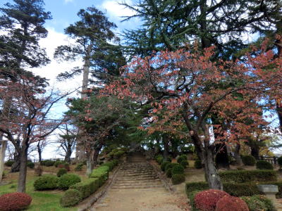 津を経て米沢に移封されるに当たり、祠堂を米沢城内に移して仏祭を厳修されて来た。明治の世を迎え祠堂のまま神祭に改め、米沢藩中興の名君鷹山公を合祀して上杉神社と称し県社に列し、同9年には新たに神殿成り、遷座祭を行う。明治35年、往時の謹皇の功により別格官幣社に列せられる。(鷹山公は新たに摂社として松岬神社を創立して正面壕の外に鎮座)先年の神社制度の改革によって社格を廃して現在に至る。 大正8年米沢市大火の際本殿以下ことごとく類焼し、同12年米沢市出身建築界の泰斗伊東忠太博士(文化勲章受章者)の設計による現在の社殿を始め一切を竣成したのであるが、境内は旧米沢城址本丸跡でその6割を占め、およそ6300坪、境域をめぐる堤上の桜花はお堀に映じ陽春4月の例祭には一段に美観を呈する。例祭は4月29日(歿年3月13日を太陽暦に換算)。 上杉神社再建に当たり、藩祖謙信公、二代景勝公、直江兼続公、十代鷹山公の遺品・遺墨等を中心に収蔵、展示する稽照殿が創設された。」。 訪れたのは2015年11月1日。天気も良く、紅葉が映えていました。 なお、松岬神社は別ページにて紹介します。 |