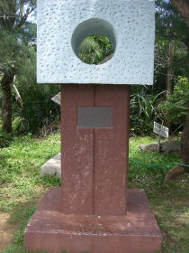 | 何か甲骨文字みたいな字体で恩納何とか記念碑と書いてある。 | 歌が載っています。「波の声もとまれ 風の声もとまれ 首里天がなし 美御機拝ま」と書かれています。「波の音も静まれ 風の音も静かになれ 今私が首里の王様のごきげんを伺いをしますから」という意味だそうだ。 | 「琉歌の里恩納」と書いてあります。 |