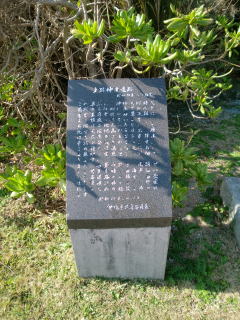 | 博物館の隣にある唐人の墓碑。 | 1824年福建省の商船が嵐のため難破し、脱出した6名が仲泊の浜に辿り着いたが、うち5名は既に死亡し、生存者は1名だったという。そして、生き残った者は仲泊の人々の看護により国に帰ることができ、死んだ者5名はこの地に葬られたという。道路工事により墓は壊され、現在は墓碑だけが残っている。 |