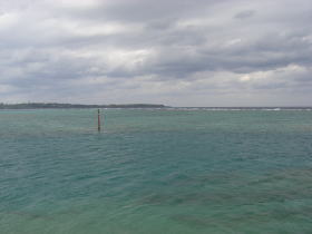 | 別の日の干潮時に撮影。 | 目印があります。満潮時にこの海の道以外を通ると船の大きさによっては座礁しそう。 |
