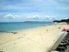| 画像補整をかけているので、若干実際の見た目とは違いますが、砂浜は綺麗な色をしています。 | 2009年の7月に訪れたので人は結構いました。とは言ってもごった返す程ではありませんが。 | 中城湾が正面にあります。 |
