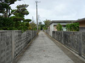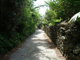 | 海側の道。石積みの壁がまだ残っています。 | 港から集落に入った道。 右側がオーバルのオオサト地区(のはず)。左側はまだグスクになるのかなぁ? |